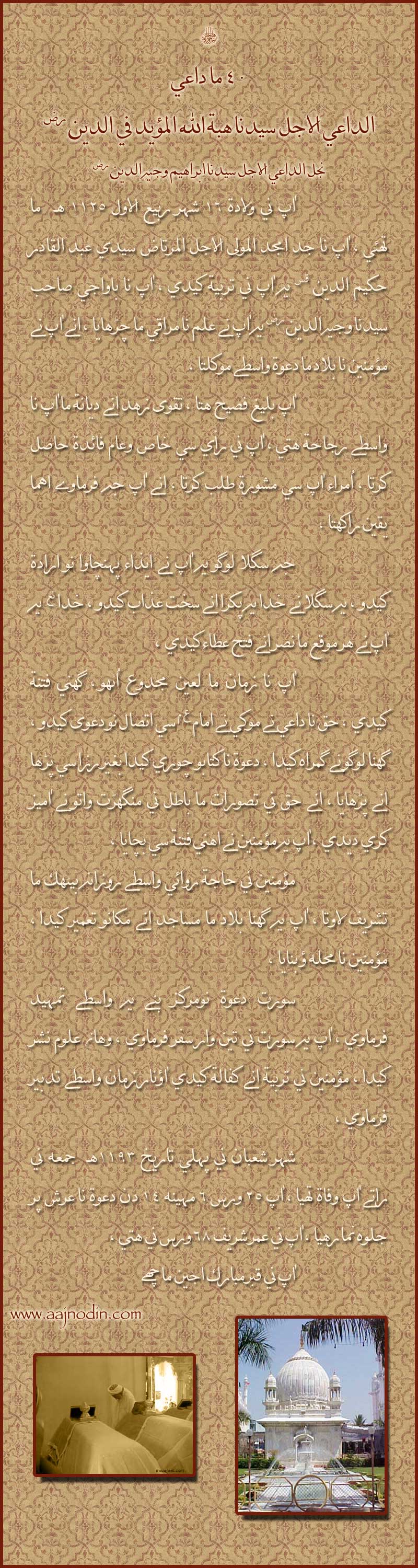 CURRENTLY VIEWING : Syedna Hebatullah Al-Moaiyyed Ibne Syedna Ibrahim Vajihuddin (AQ) 40ma Dai ul Mutlaq Ujjain